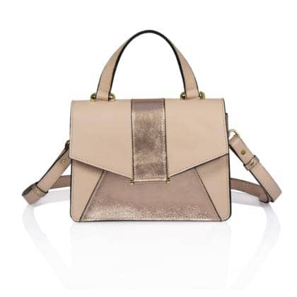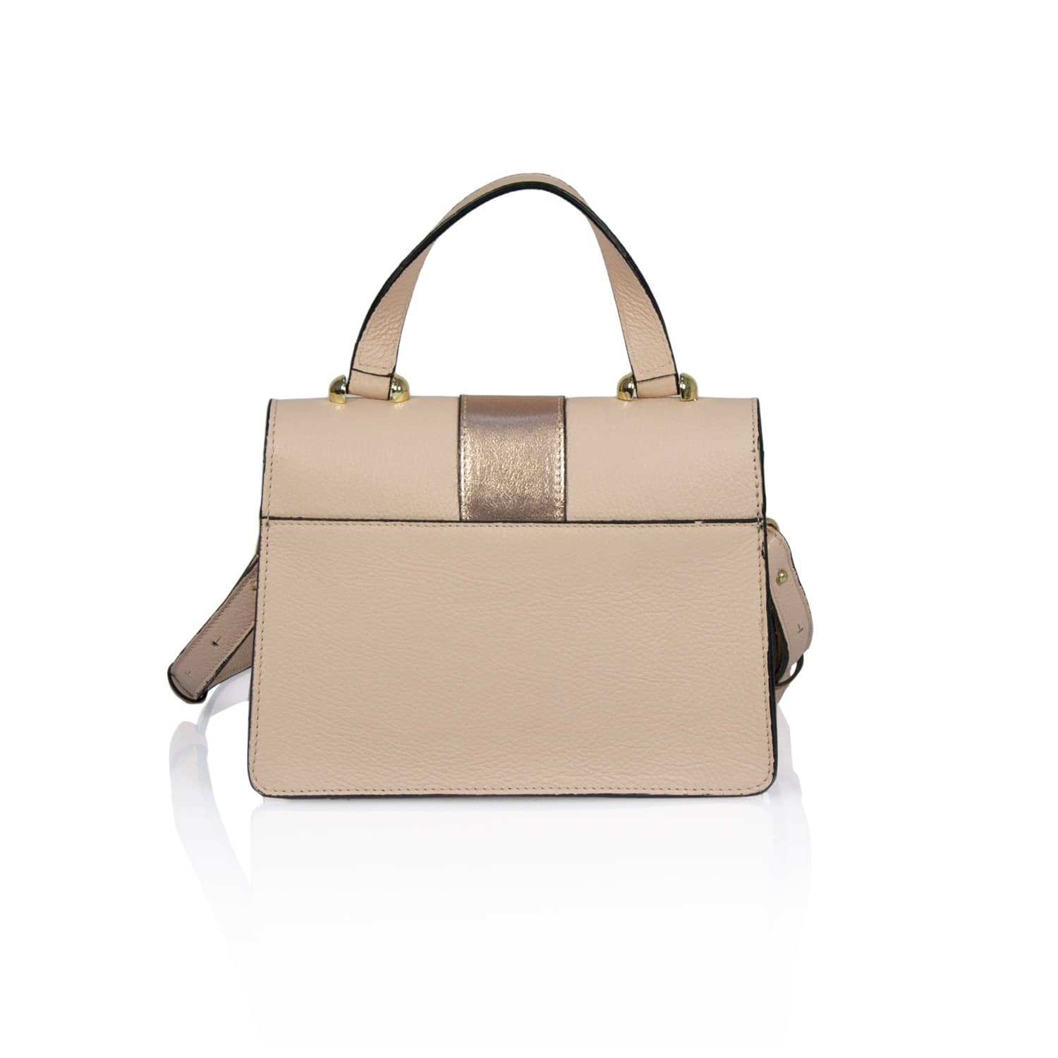 Genuine leather handbag, magnetic clip closure, internal zip pocket, adjustable and removable shoulder strap in real leather, genuine leather handle. Tone-on-tone metallic leather parts. lined